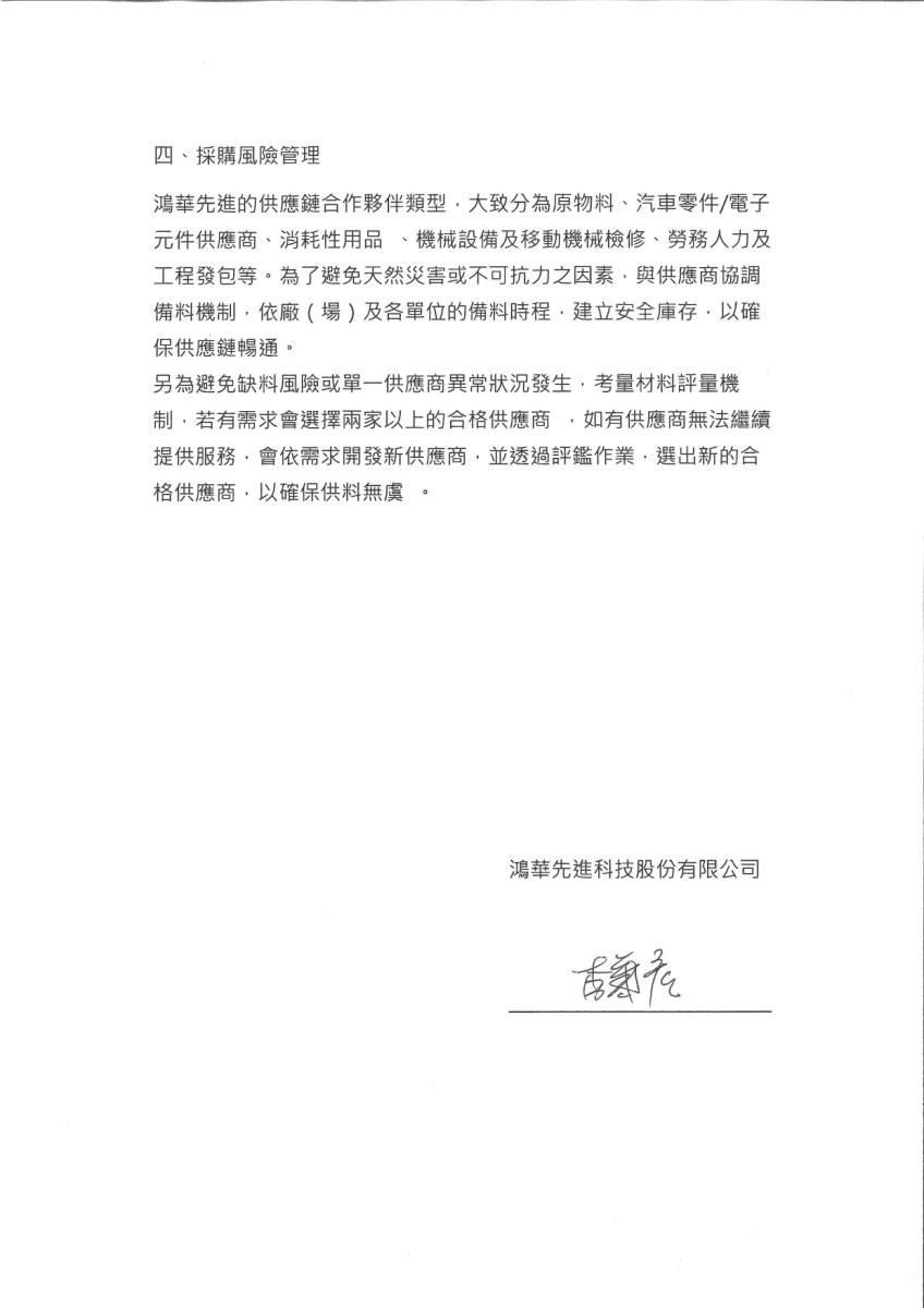 鸿华先进为落实供应链的永续发展,着手建构供货商管理准则,促进与供货商的双赢绩效。依据ISO9001质量管理系统之采购作业程序规范,针对有登录于合格供货商名单中的供货商或承揽商执行相关之评估作业,且于供货商管理中详述不符合时所采取之行动。