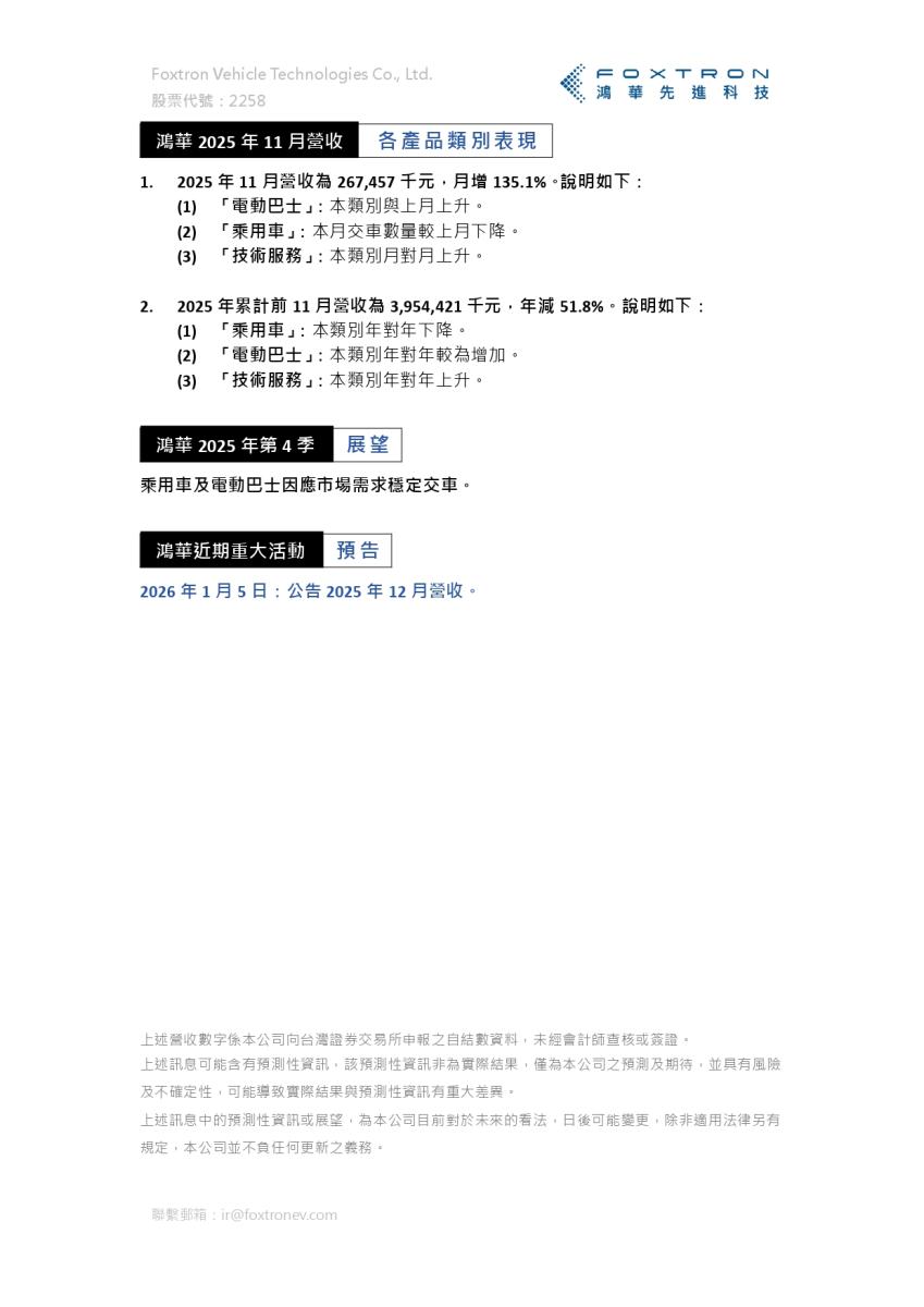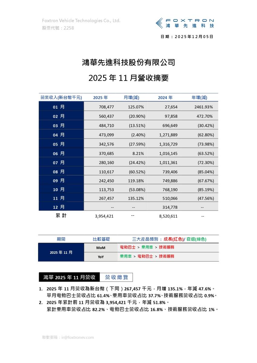 鸿华先进科技股份有限公司 2025年11月营收摘要