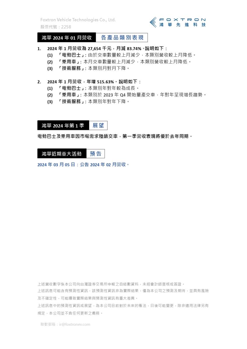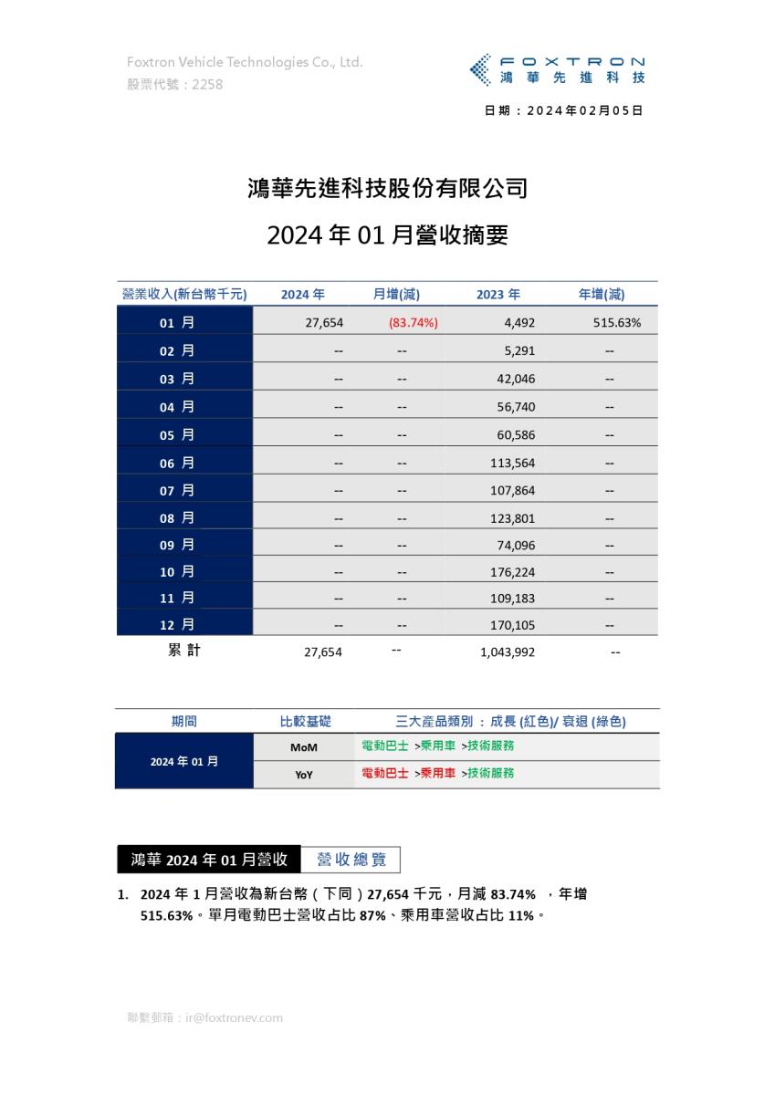 鸿华先进科技股份有限公司 2024年1月营收摘要