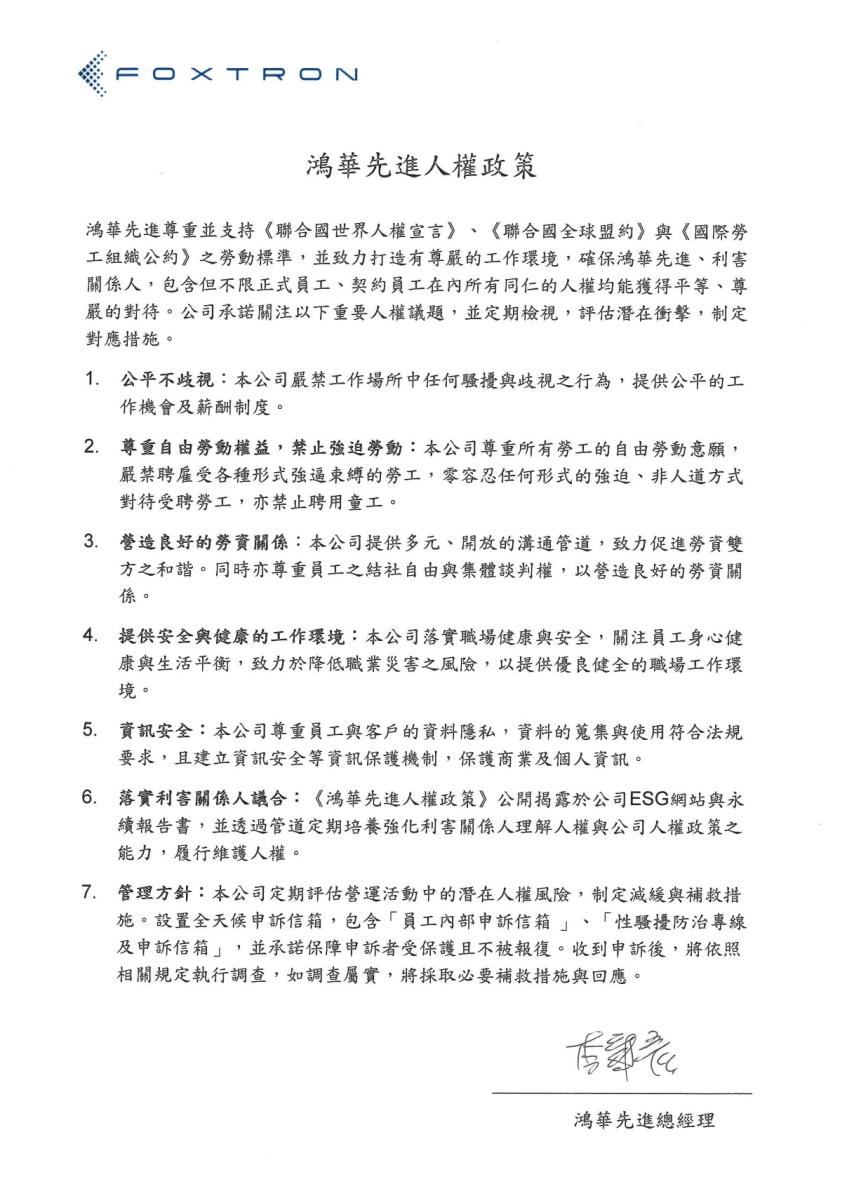 鸿华先进尊重并支持《联合国世界人权宣言》、《联合国全球盟约》与《国际劳工组织公约》之劳动標准,并致力打造有尊严的工作环境,确保鸿华先进、利害关系人,包含但不限正式员工、契约员工在内所有同仁的人权均能获得平等、尊严的对待。公司承诺关注以下重要人权议题,并定期检视,评估潜在冲击,制定对应措施。