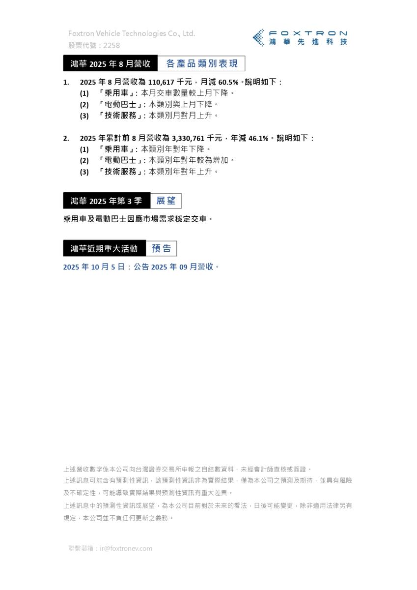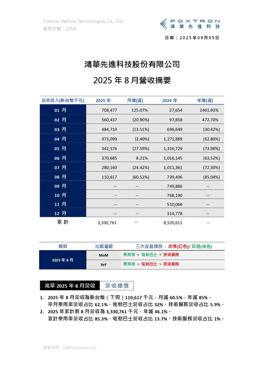 鴻華先進科技股份有限公司 2025年8月營收摘要