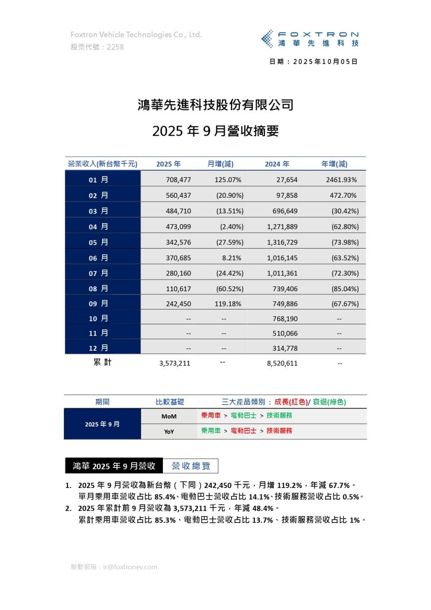 鴻華先進科技股份有限公司 2025年9月營收摘要
