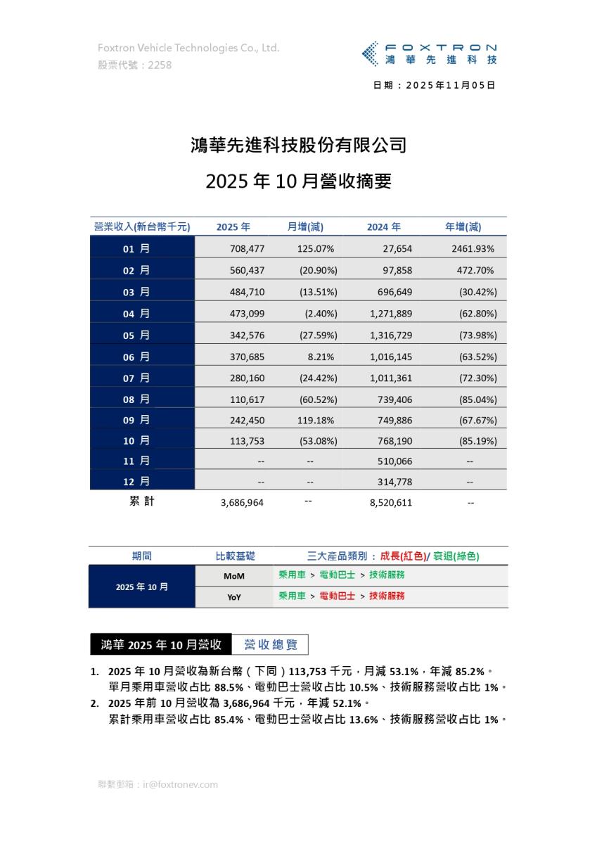 鴻華先進科技股份有限公司 2025年10月營收摘要