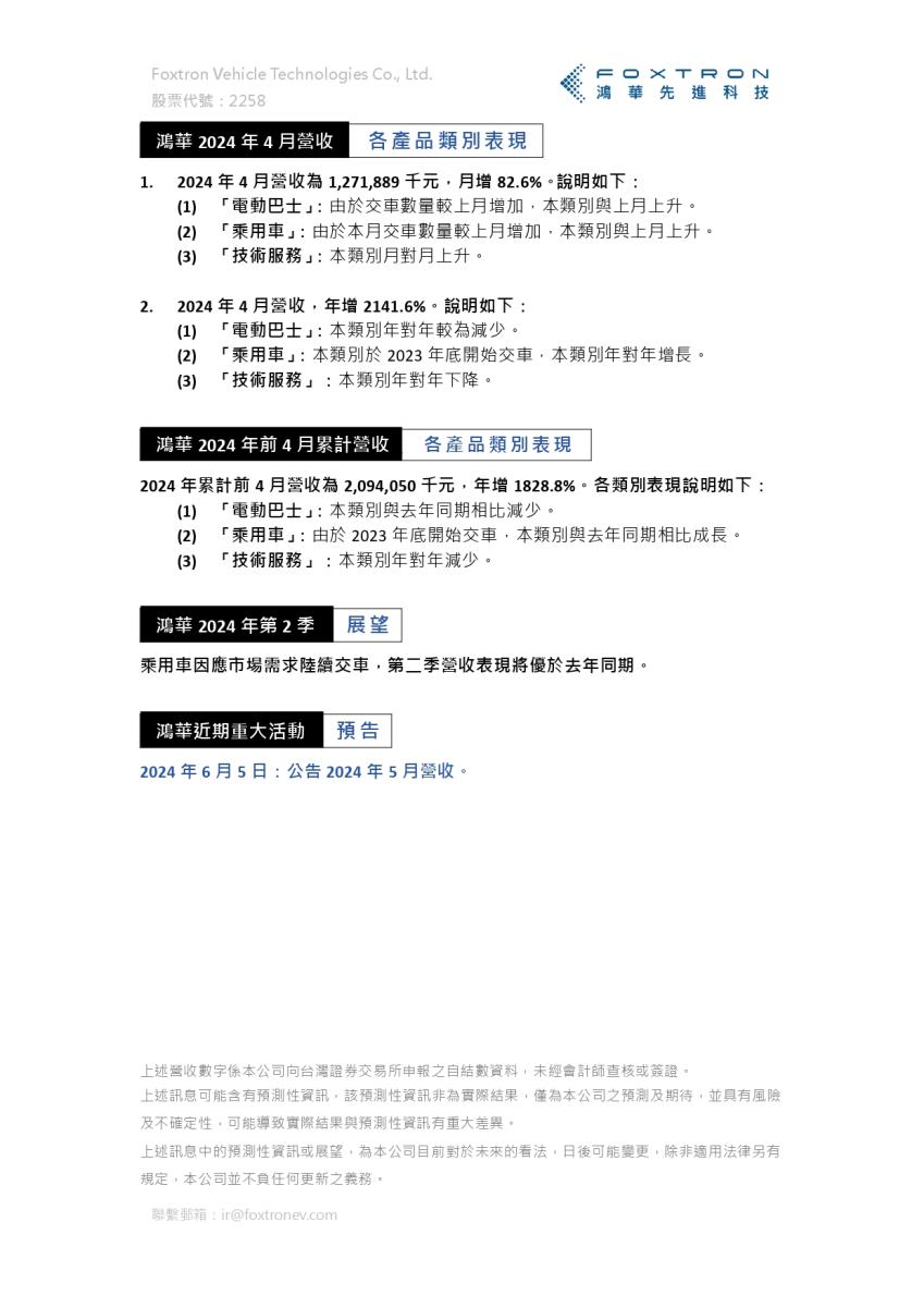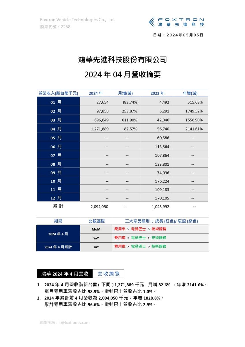 鴻華先進科技股份有限公司 2024年04月營收摘要